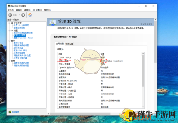 第一步:勇者挥动鼠标,右键点击N卡控制面板,锁定3D设置,瞄准全局设置,锁定DSR因数。